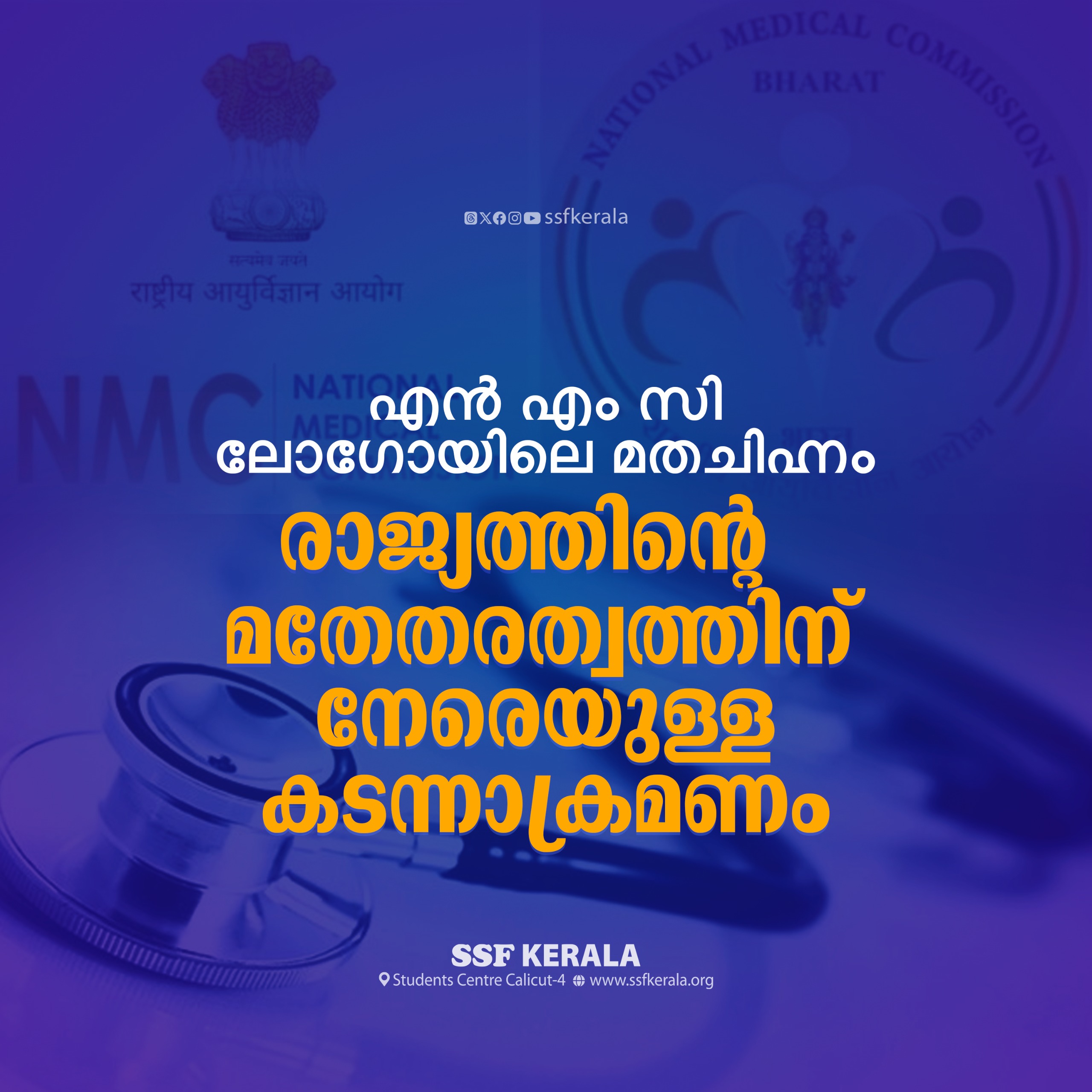 നാഷണൽ മെഡിക്കൽ കമ്മീഷൻ ലോഗോയിൽ നിന്ന് ദേശീയചിഹ്നം ഒഴിവാക്കി ധന്വന്തരിയുടെ ചിത്രം ചേർത്ത് പരിഷ്കരിച്ച കേന്ദ്ര സർക്കാർ നടപടി രാജ്യത്തിന്റെ മതേതരസ്വഭാവത്തെ കടന്നാക്രമിക്കുന്നതാണ്. തിരഞ്ഞെടുപ്പ് മുന്നിൽ കണ്ടുള്ള ഗിമ്മിക്കുകളുടെ ഭാഗമാണ് ആരോഗ്യസംവിധാനങ്ങളെ കാവിവത്കരിക്കുന്നതിന്റെ ഭാഗമായി നടക്കുന്ന ഇത്തരം നീക്കങ്ങൾ. ആരോഗ്യമേഖലയിൽ സേവനം ചെയ്യുന്നവരുടെ ആത്മവീര്യം ചോർത്തിയ ഈ നടപടിയിൽ നിന്ന് പിന്മാറാൻ സർക്കാർ തയാറാവണം. ഹെൽത്ത് സെന്ററുകളുടെ പേര് ആയുഷ്മാൻ ആരോഗ്യമന്ദിർ എന്നാക്കി റീബ്രാൻഡ് ചെയ്യാനും പേരിനൊപ്പം ‘ആരോഗ്യം പരമം ധനം’ എന്ന ടാഗ് ലൈൻ ചേർക്കാനും കേന്ദ്രസർക്കാർ സംസ്ഥാന സർക്കാരുകൾക്ക് ഈയിടെ നിർദേശം നൽകിയിരുന്നു. സംസ്ഥാന സർക്കാരുകളുടെ കീഴിലുള്ള ആരോഗ്യമേഖലയിലെ സ്ഥാപനങ്ങളിൽ പരമാവധി അഞ്ച് ശതമാനം മാത്രമാണ് കേന്ദ്രപങ്കാളിത്തം. സംസ്ഥാന സർക്കാരുകൾ വിവിധ പദ്ധതികളിലും പ്രൊജക്ടുകളിലും ഉൾപ്പെടുത്തി വികസിപ്പിച്ചെടുക്കുന്ന ആരോഗ്യകേന്ദ്രങ്ങൾക്ക് പേരും ബോർഡും മാറ്റാൻ നിർദേശിക്കുന്നതിൽ രാഷ്ട്രീയതാത്പര്യമുണ്ട്. ജനങ്ങളെ നേരിട്ട് സ്പർശിക്കുന്ന ആരോഗ്യസംവിധാനങ്ങളെ അധികാര താത്പര്യങ്ങൾക്കും രാഷ്ട്രീയ പ്രചാരണങ്ങൾക്കും വേണ്ടി ദുരുപയോഗിക്കുന്ന നടപടികൾ തുടർന്ന് പോരുന്നത് ജനാധിപത്യരാജ്യത്തെ സർക്കാരിന് ഭൂഷണമല്ല. ഹെൽത്ത് സെന്ററുകളുടെയും ആശുപത്രികളുടെയും സൗകര്യങ്ങളും കാര്യക്ഷമതയും വർധിപ്പിക്കുന്നതിനുള്ള നടപടികളിൽ ശ്രദ്ധ ചെലുത്തുന്നതിന് പകരം പേര് മാറ്റം പോലുള്ള ഗിമ്മിക്കുകൾക്ക് പ്രാധാന്യം നൽകുന്നതിലൂടെ, പൗരന്മാരെ ചെറുതായി കാണുകയും അപഹസിക്കുകയുമാണ് കേന്ദ്രസർക്കാർ ചെയ്ത് കൊണ്ടിരിക്കുന്നത്.