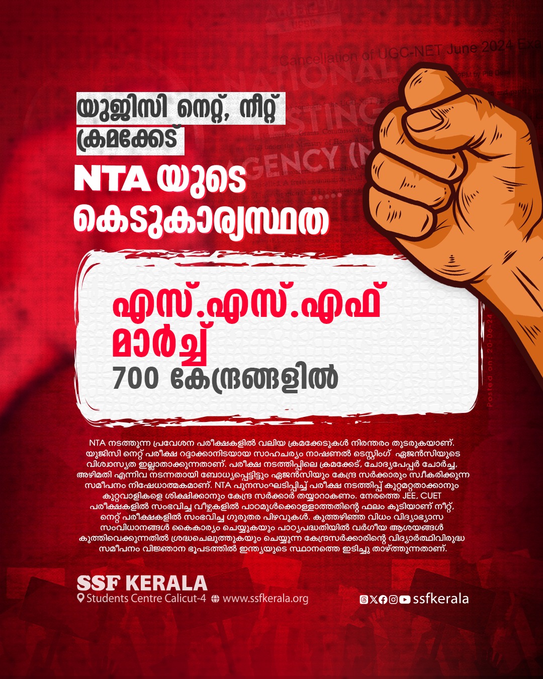 സമീപിക്കാനോ പരിഹരിക്കാനോ ഏജൻസിയും കേന്ദ്ര സർക്കാരും ശ്രമിക്കാതിരുന്നത് കൊണ്ടാണ് ഇത്തരം വീഴ്ചകൾ ആവർത്തിക്കപ്പെടുന്നത്. 24 ലക്ഷം വിദ്യാർത്ഥികൾ എഴുതിയ NEET-UG 2024 ന് പരീക്ഷാ നടത്തിപ്പിലെ വീഴ്ച കൊണ്ടും ചോദ്യപേപ്പർ ചോർച്ച കൊണ്ടും വിശ്വാസ്യത നഷ്ടമായി. ഈ ഘട്ടത്തിലാണ് 11 ലക്ഷം പേർ പരീക്ഷയെഴുതിയ യുജിസി നെറ്റ് ചോദ്യപേപ്പർ ചോർച്ചയുടെ പേരിൽ റദ്ദാക്കേണ്ടി വന്നിരിക്കുന്നത്. ലക്ഷക്കണക്കിന് വിദ്യാർത്ഥികളുടെ ജീവിതം കൊണ്ട് പന്താടുന്ന സമീപനം എൻടിഎ എന്ന കേന്ദ്ര ഏജൻസിയിൽ നിന്ന് നിരന്തരം സംഭവിച്ചു കൊണ്ടിരിക്കുന്നത്.