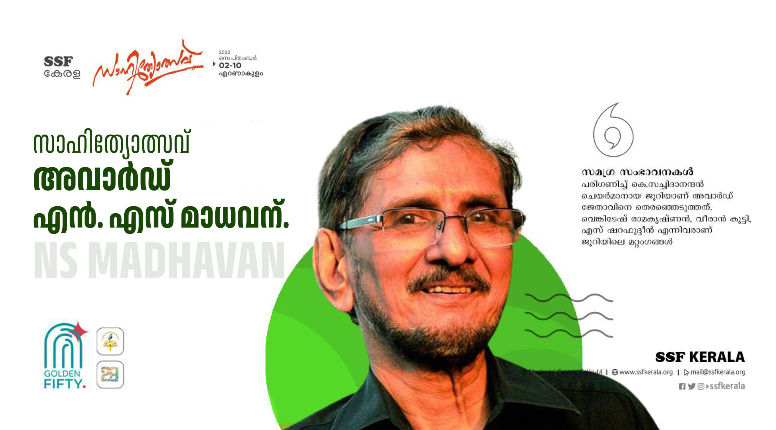 ഈ വർഷത്തെ എസ്. എസ്. എഫ് സാഹിത്യോത്സവ് അവാർഡ് പ്രമുഖ എഴുത്തുകാരൻ എൻ. എസ് മാധവന്. 50,000 രൂപയും ശിലാഫലകവുമടങ്ങുന്നതാണ് അവാർഡ്. കേരള സാഹിത്യ അക്കാദമി പ്രസിഡൻ്റ് സച്ചിദാനന്ദൻ, മുതിർന്ന മാധ്യമപ്രവർത്തകൻ വെങ്കിടേഷ് രാമകൃഷ്ണൻ, കവി വീരാൻ കുട്ടി, രിസാല മാനേജിംഗ് എഡിറ്റർ എസ്. ശറഫുദ്ദീൻ എന്നിവരടങ്ങുന്ന ജൂറിയാണ് എൻ.എസ് മാധവനെ ഈ വർഷത്തെ സാഹിത്യോത്സവ് അവാർഡിനായി തെരഞ്ഞെടുത്തത്. മലയാള കഥാസാഹിത്യ ചരിത്രത്തിലെ ഏറ്റവും ജാഗ്രത്തായ സാന്നിധ്യമായ എൻ.എസ് മാധവൻ കഥയിൽ പ്രകാശിതമാവുന്ന രാഷ്ട്രീയ ഉണർച്ചകളെ ജീവിതത്തിലും ആവിഷ്കരിച്ചു. നമ്മുടെ കാലം കലുഷിതമാവുമ്പോഴെല്ലാം ഇടപെടുകയും ഇന്ത്യാദേശത്തി ന്റെ മതേതര – ബഹുസ്വര ജീവിതത്തെ കൂടുതൽ ശക്തമാക്കാൻ നിരന്തരം എഴുതുകയും ചെയ്ത എഴുത്തുകാരനാണ് മാധവനെന്ന് ജൂറി അഭിപ്രായപ്പെട്ടു. സെപ്തംബർ നാല് ഞായറാഴ്ച വൈകുന്നേരം നാലുമണിക്ക് എറണാകുളം ടൗൺഹാളിൽ മുതിർന്ന മാധ്യമ പ്രവർത്തകൻ തോമസ് ജേക്കബ് അവാർഡ് സമ്മാനിക്കും. ചടങ്ങിൽ പ്രമുഖർ സംബന്ധിക്കും.