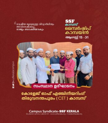 “രാഷ്ട്രീയ മൂല്യമുള്ള വിദ്യാർത്ഥിത്വം അവശേഷിക്കും, രാജ്യം ബാക്കിയാകും” എന്ന പ്രമേയത്തിൽ 2023-24 അക്കാദമിക വർഷത്തേക്കുള്ള കാമ്പസ് മെമ്പർഷിപ് കാമ്പയിൻ സംസ്ഥാന ഉദ്ഘാടനം തിരുവനന്തപുരം CET കോളേജിൽ വെച്ച് സംസ്ഥാന അധ്യക്ഷൻ ഫിർദൗസ് സുറൈജി സഖാഫി നിർവഹിച്ചു. തുടർന്ന് കേരളത്തിലെ വിവിധ കാമ്പസുകളിൽ …