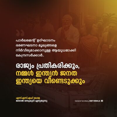 എസ് എസ് എഫ് കേരള ജനറൽ സെക്രട്ടറി എഴുതുന്നു… പുതിയ പാർലമെൻറ് മന്ദിരത്തിൻറെ ഉദ്ഘാടനം ഭരണഘടനയെ നിർവീര്യമാക്കാനുള്ള ഹിന്ദുത്വ പദ്ധതിയുടെ ആയുധമാക്കി മാറ്റുകയാണ് കേന്ദ്രസർക്കാർ ചെയ്തിരിക്കുന്നത്. രാജ്യത്തിനു മതമില്ലെന്ന ആശയത്തെ ആഘോഷപൂർവം നിരാകരിക്കുന്ന നടപടിക്രമങ്ങൾക്ക് ഇന്ന് രാജ്യതലസ്ഥാനം സാക്ഷിയായി. ഹിന്ദുത്വ – …