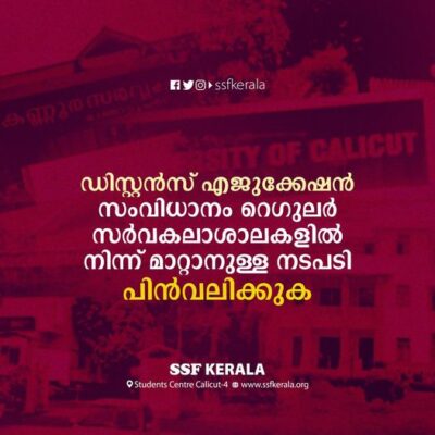 വിദൂര വിദ്യാഭ്യാസ സംവിധാനം റെഗുലർ സർവ്വകലാശാലകളിൽ നിന്ന് ഓപ്പൺ സർവ്വകലാശാലകളിലേക്ക് മാറ്റാനുള്ള സർക്കാർ നടപടി, വിദ്യാർത്ഥികളുടെ പഠനസ്വാതന്ത്ര്യം നിഷേധിക്കുന്നതും നിർധന വിദ്യാർത്ഥികൾക്കുമേൽ വൻ സാമ്പത്തിക ബാധ്യത അടിച്ചേൽപ്പിക്കുന്നതുമാണ്. റെഗുലർ സർവകലാശാലകൾക്ക് കീഴിലുള്ള വിദൂര വിദ്യാഭ്യാസ സ്ഥാപനങ്ങൾ, അലോട്ട്മെൻ്റിൽ നേരിട്ട് പ്രവേശനം നേടാൻ …