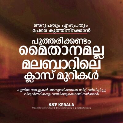 പ്ലസ് വൺ സീറ്റ് ക്ഷാമം വടക്കൻ ജില്ലകളിൽ നില നിൽക്കുകയും, ഇത് സംബന്ധിച്ച് തുടർച്ചയായ വർഷങ്ങളിൽ പ്രതിഷേധങ്ങൾ നടക്കുകയും ചെയ്തിട്ടും ശാശ്വത പരിഹാരം കാണാതെ ഉദാസീനമായ സമീപനമാണ് സർക്കാർ സ്വീകരിച്ചു കൊണ്ടിരിക്കുന്നത്. എസ് എസ് എൽ സി റിസൾട്ട് വന്നു പ്ലസ് …